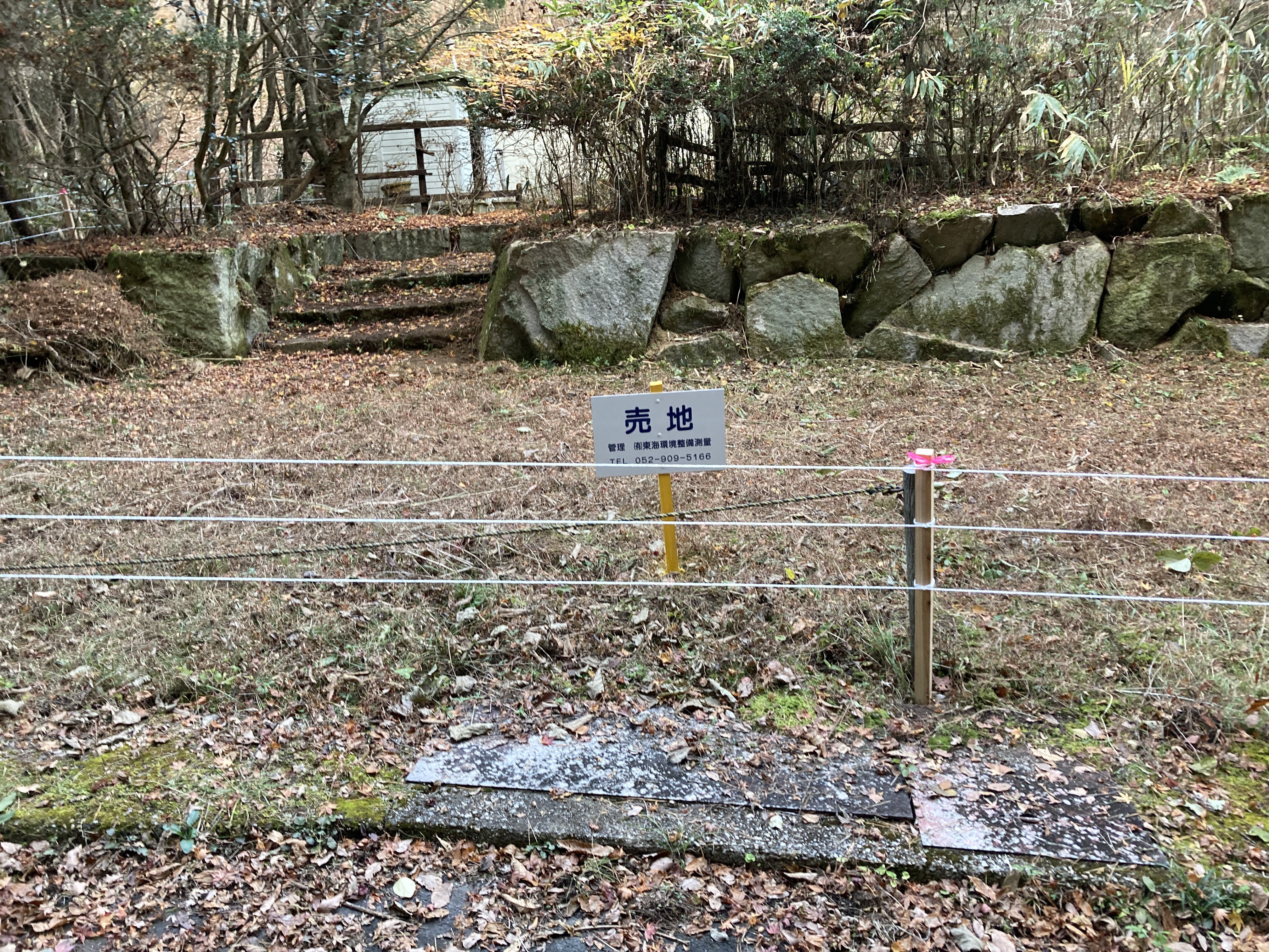 現地状況 緩やかな丘陵地を約32区画分筆された分譲地で現況山林地、当時畑菜園地で利用 の際、建てられたセカンドハウス小屋が2棟有り、本件区画地が其の内の1棟です。 もう1棟は現在放置で利用形跡無。 本件区画地は玄関間口部が町道に面し幅員4mのアスファルト 舗装道で区画地側道(分譲地内道路部)は幅員3m、現状車での進入は可能。 区画形状は方形で2区画を一つに整地した平坦地、石垣ひな壇の敷地と玄関間口部は駐車場として 庭石(割栗石)で整地、現状少しの雑草有りますが普通乗用車で4台の駐車スペース。 以前は畑菜園地で利用し、セカンドハウス付きアウトドア用地としても最高の立地。 |